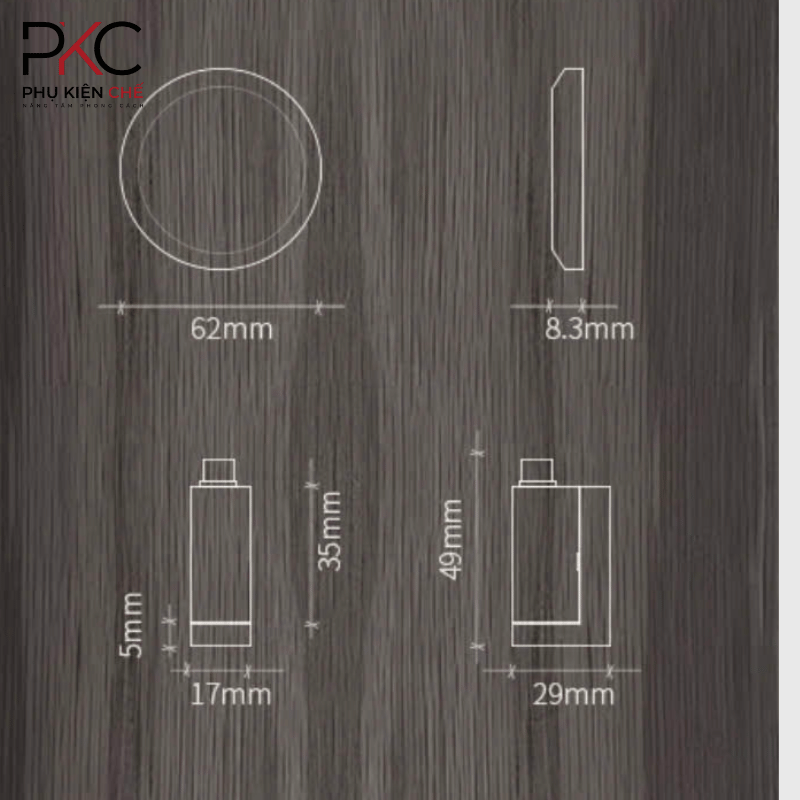 - Đế tròn gắn sàn: Đường kính 62mm, Dày 8.3mm