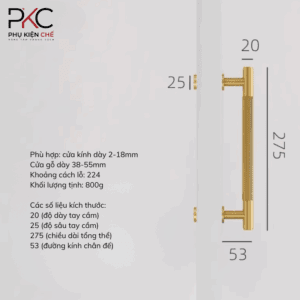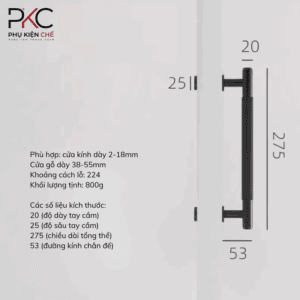 Kích thước linh hoạt: Chiều dài tổng thể 275mm, khoảng cách lỗ 224mm, phù hợp với nhiều loại cửa.