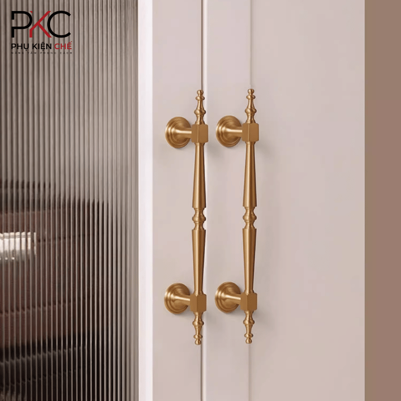 • Thiết kế cổ điển đầy uy lực: Tay nắm có thân tròn trịa, vững chãi với hai đầu được trang trí bằng chi tiết chóp nhọn (finial) cổ điển, gợi nhớ đến kiến trúc hoàng gia Pháp. Thiết kế này không chỉ đẹp mắt mà còn tạo cảm giác cầm nắm rất chắc chắn và thoải mái.