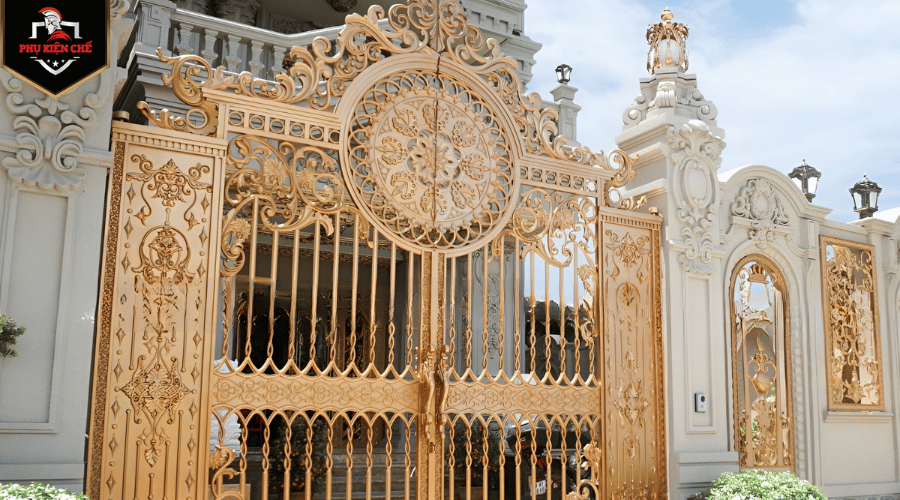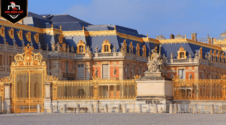 Cửa cổng sắt Cung điện Versailles ở Pháp: Cổng sắt từ chất liệu r wrought iron mạ vàng của Cung điện Versailles cũng là một trong những công trình kiến trúc tráng lệ nhất nước Pháp, với thiết kế từ ngay cổng vào thể hiện cho quyền lực tối cao, điêu khắc tỉ mỉ trên chất liệu bằng sắt.