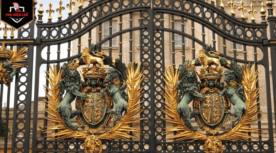 Cửa cổng sắt Cung điện Buckingham ở London, Anh: Cổng chính của Cung điện Buckingham được làm bằng sắt r wrought iron mạ vàng, là một biểu tượng nổi tiếng của Hoàng gia Anh. Cổng được thiết kế theo phong cách Baroque và có hoa văn trang trí tinh xảo.